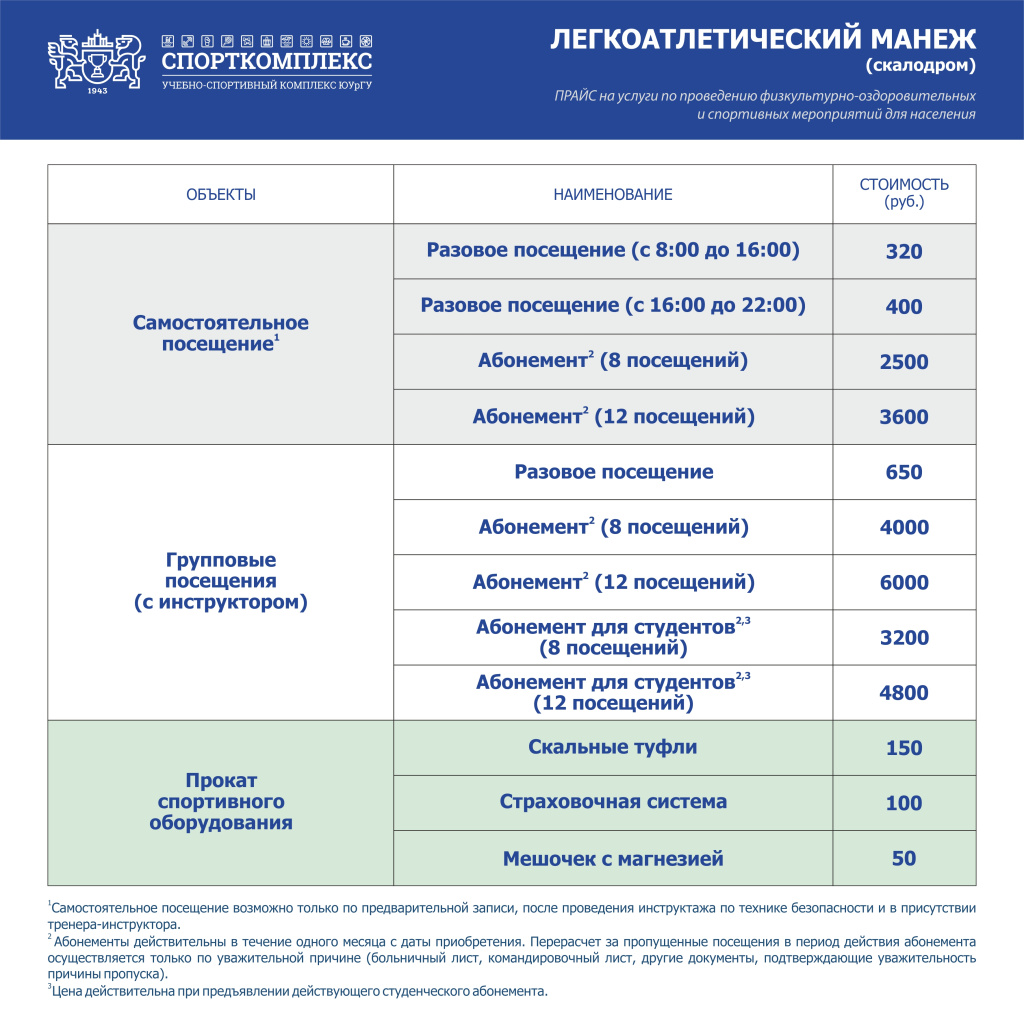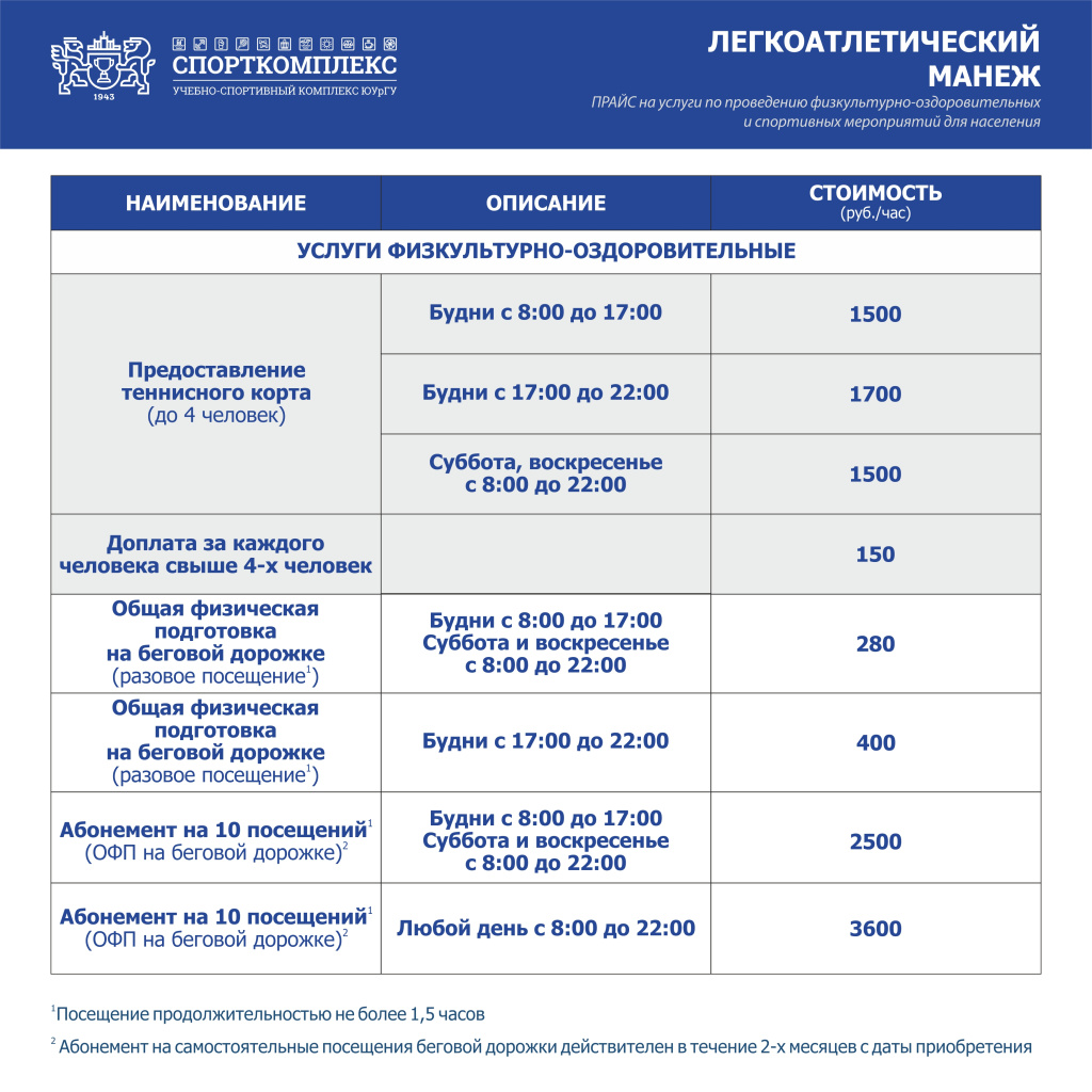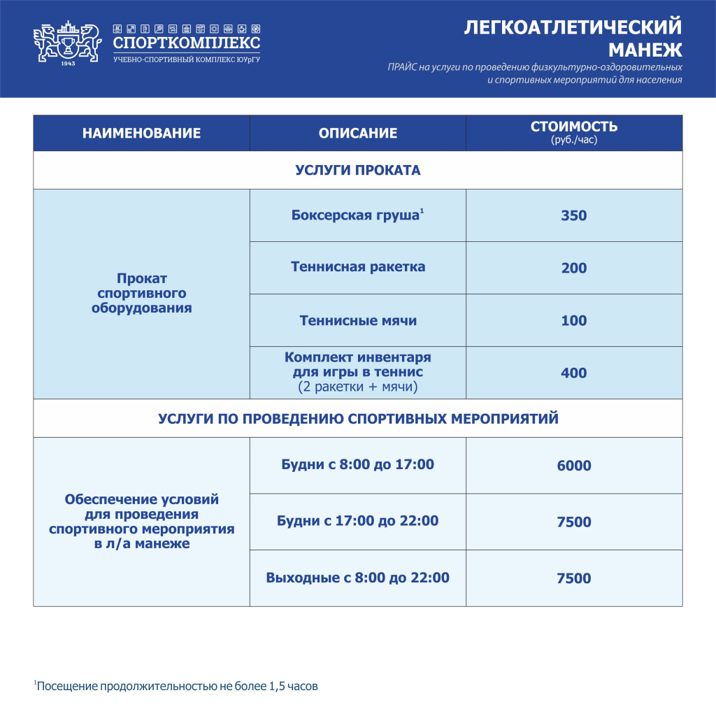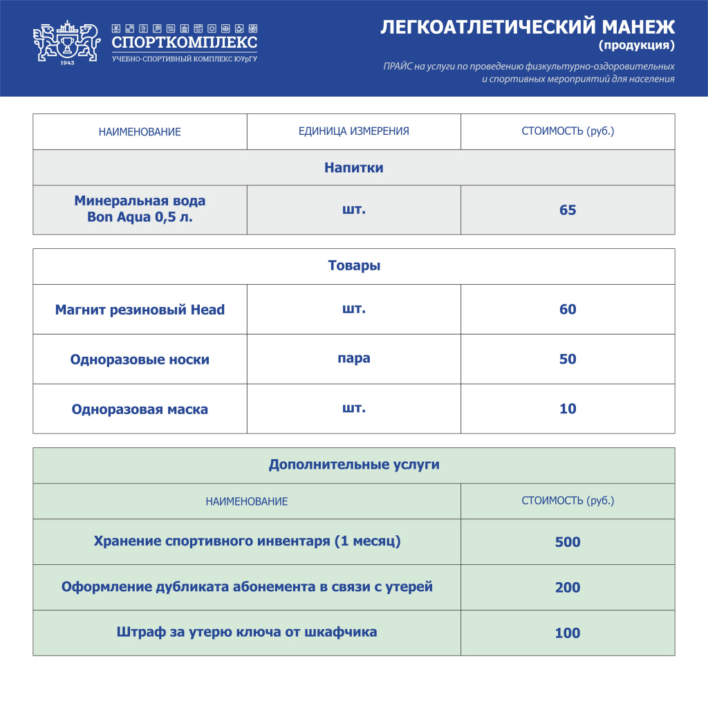 На территории легкоатлетического манежа находятся 2 теннисных корта, скалодром, боксёрский ринг. Подробная информация и запись в группы по телефону: 267-99-98